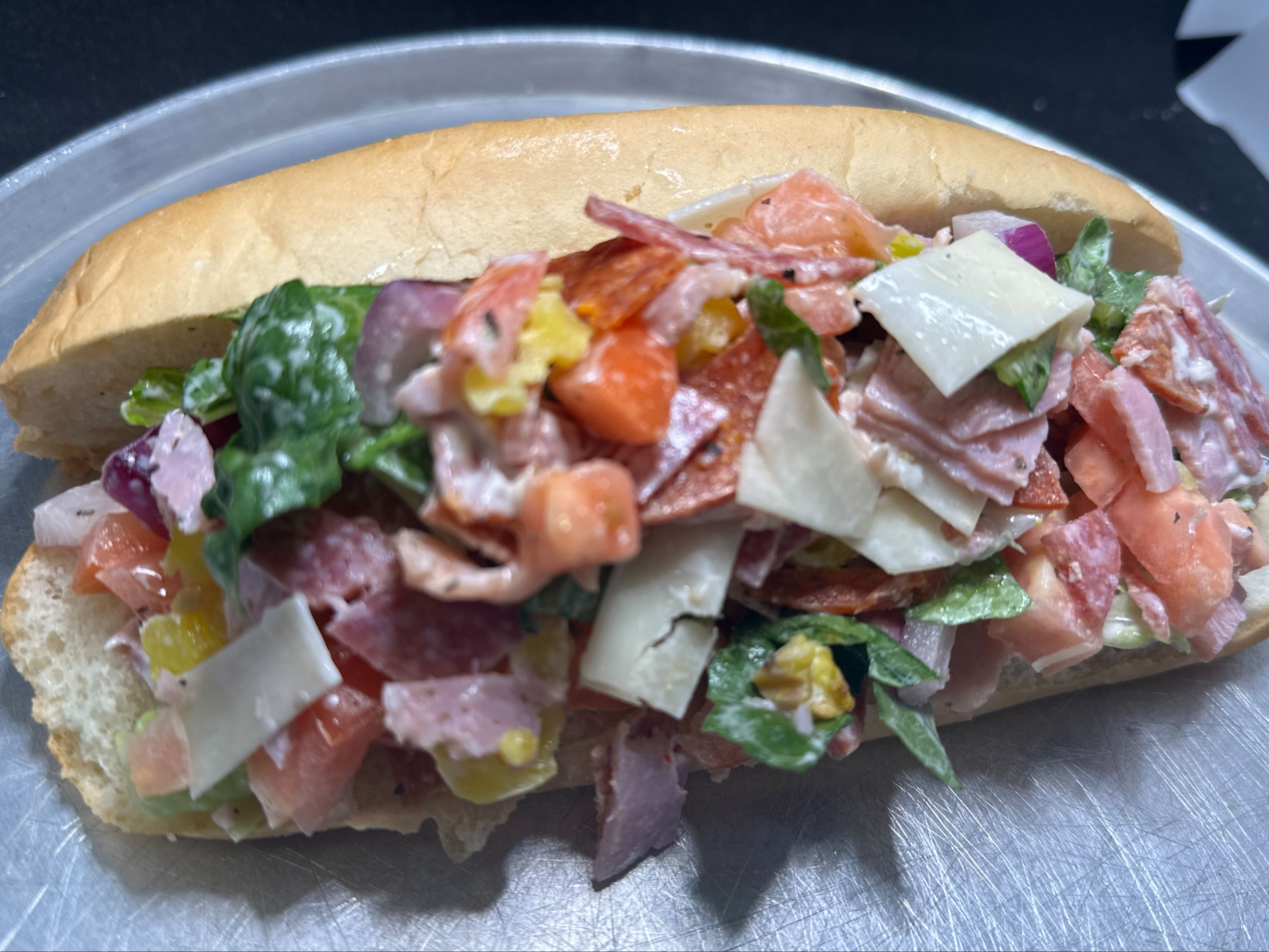 Salami, ham, pepperoni, provolone cheese, banana peppers, red onion, lettuce, mayonnaise, sliced tomato, olive oil, red wine vinegar, salt, pepper & Italian dressing