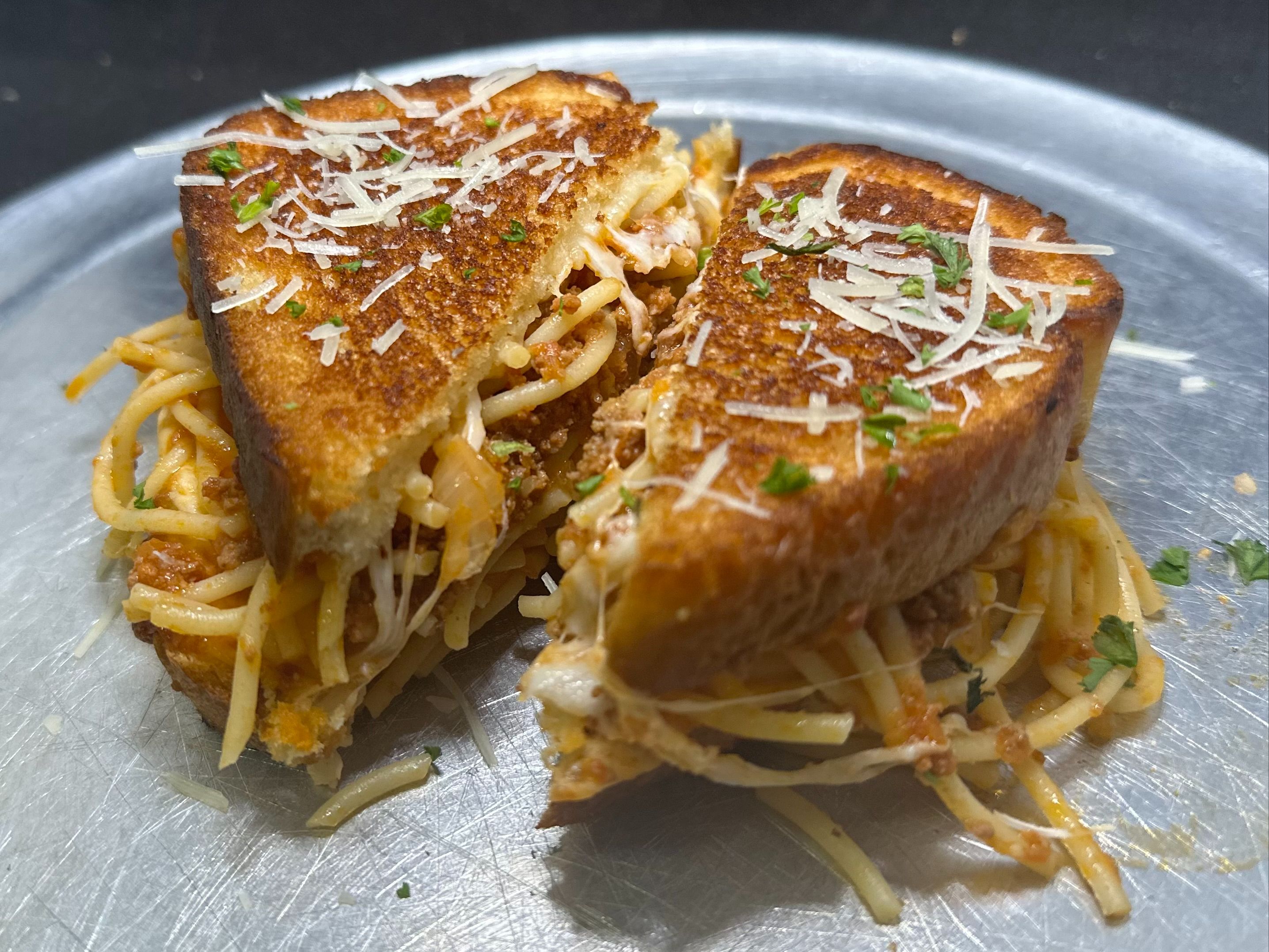 Our Bolognese Sauce Tosssed With Spaghetti Noodles Between Two Slices Of Grilled Garlic Butter Texas Toast With Melted Mozzarella