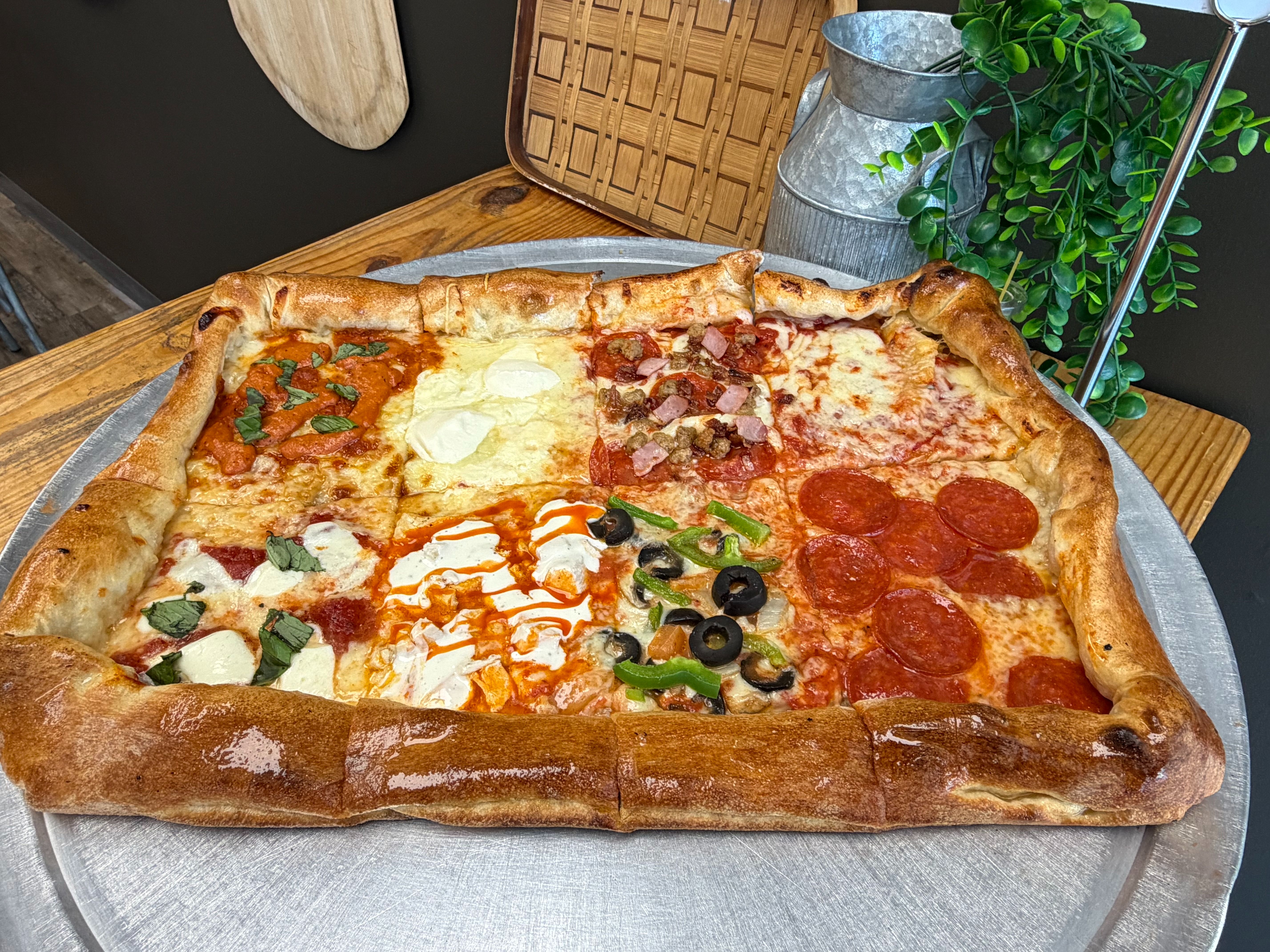 A traditional Grandma's pizza is made with simple ingredients and baked in a rectangle pan giving it a thinner, crispier texture. Well here is the Grandkids version of it! A little something for everyone! This comes one size and is considered a large pizza. You will get eight squares all of different kinds of pizzas. One slice each of Cheese, Pepperoni, Meat Lovers, Veggie, Spicy Vodka, Buffalo Chicken, White & Margherita. This item is uncustomizable.