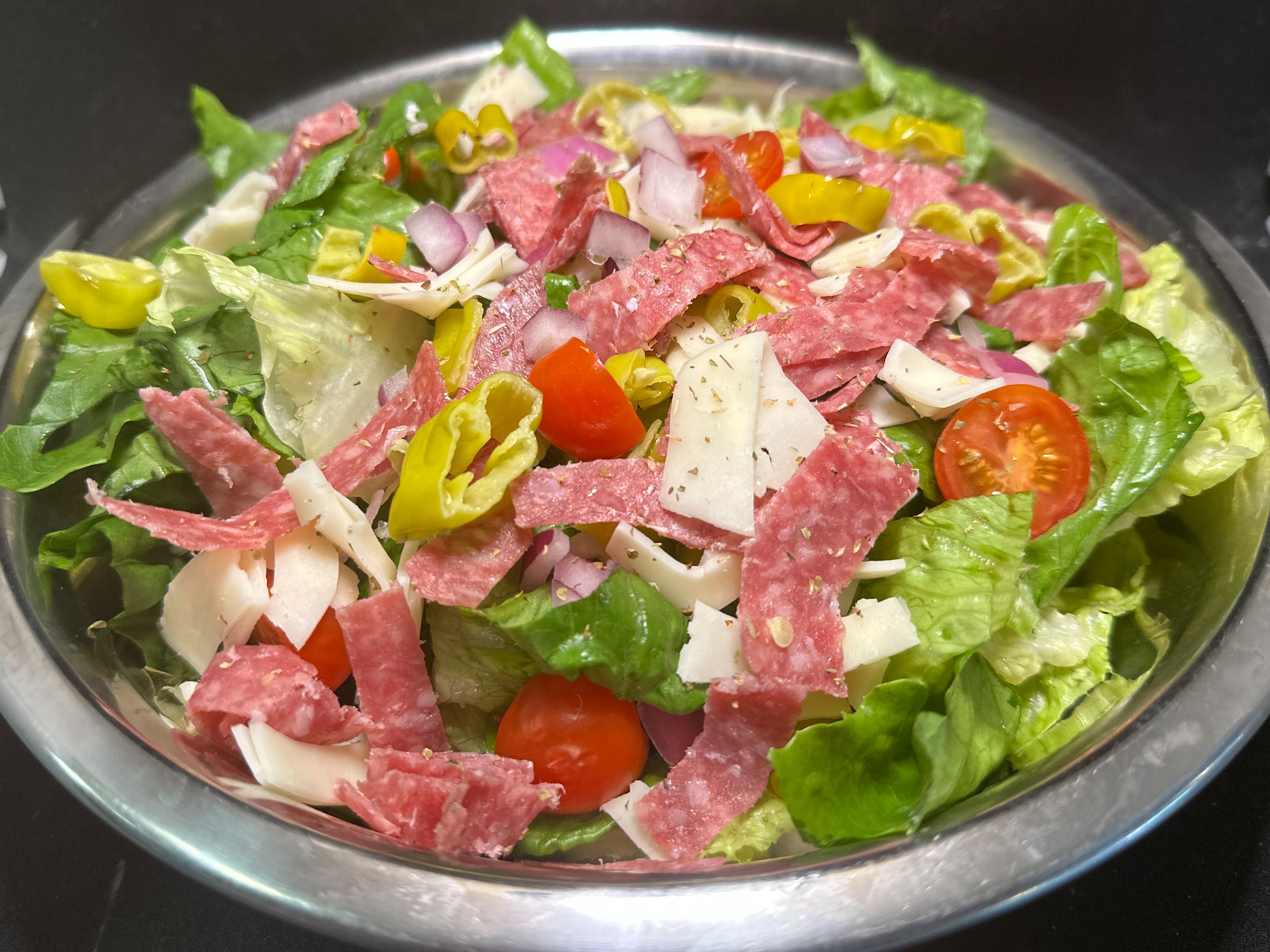 Iceberg lettuce, salami, cherry tomatoes, red onion, pepperoncini peppers, lemon, oregano & provolone all chopped up and topped with our house made vinaigrette & Parmesan cheese