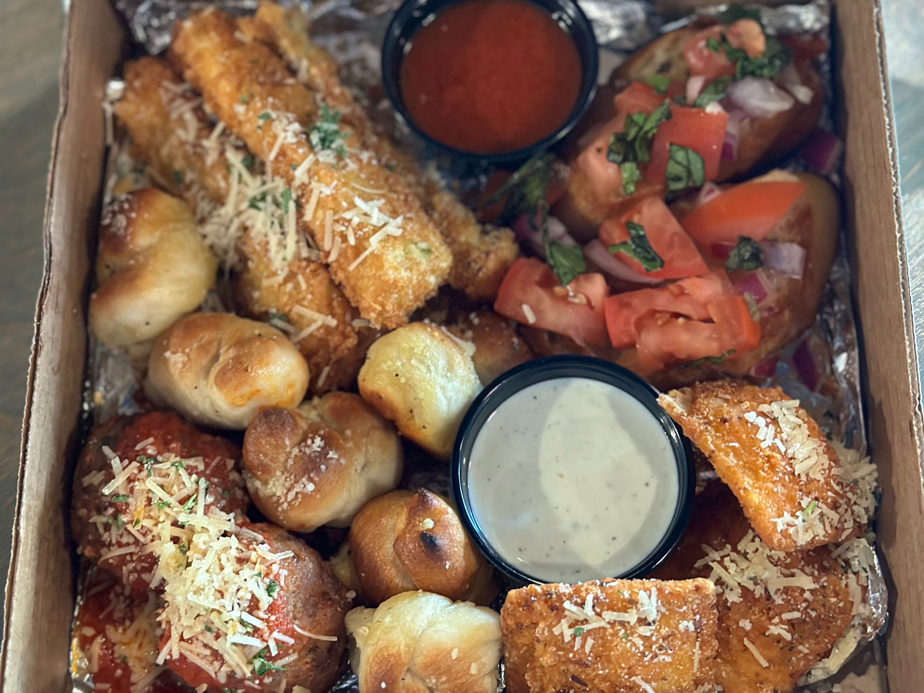 An 8" Pizza Box With A Sampling Of Appetizers. Three Fried Zuchinni Sticks, Two Pieces Of Brushetta, Two Fried Mozzarella Circles, Two Homemade Meatballs With Marinara, Six Garlic Knots With Ranch And Marinara Dipping Sauces