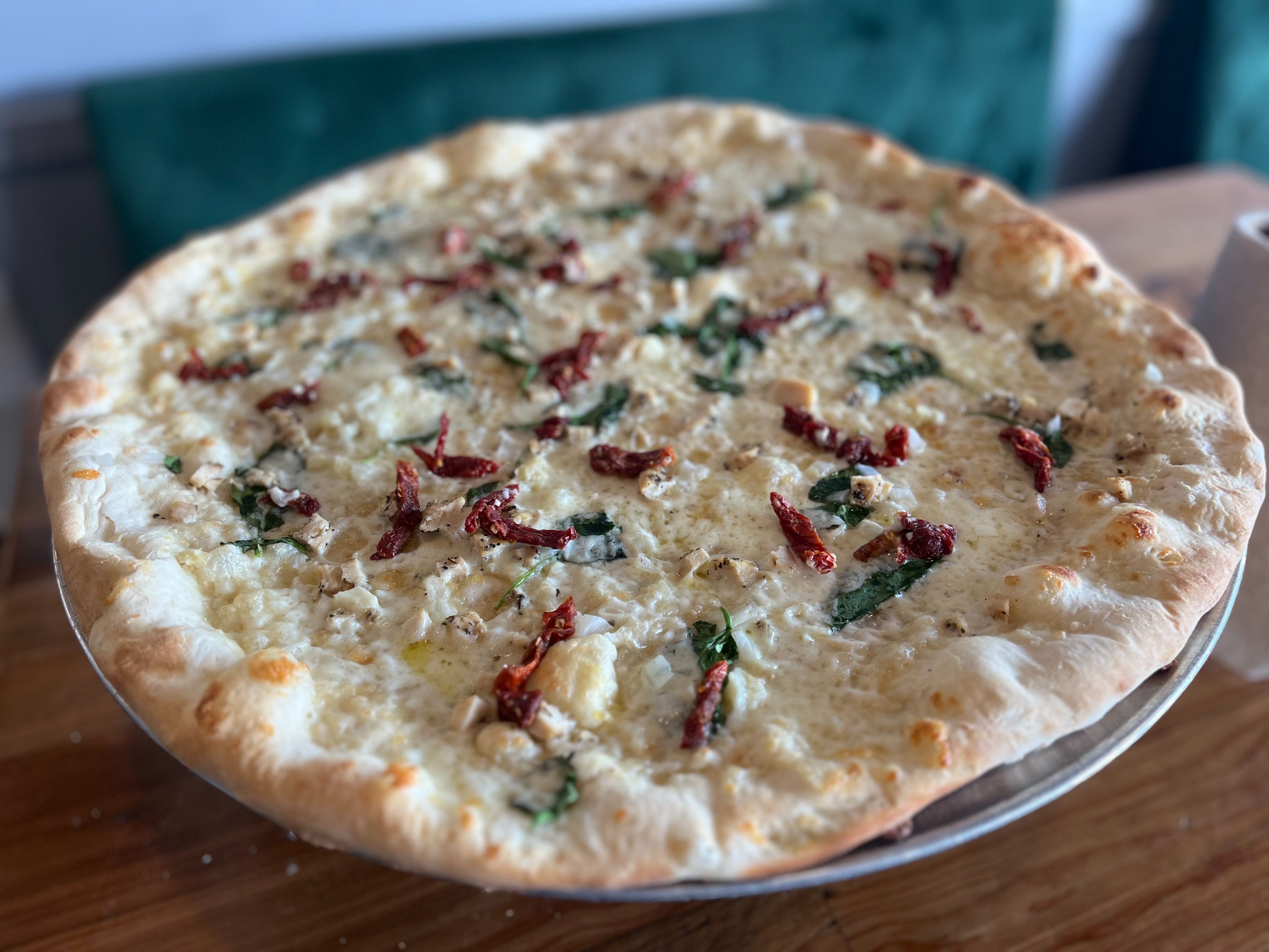 Alfredo Sauce, Mozzarella Cheese, Garlic, Sundried Tomatoes, Spinach, Onions, Mushrooms & Chicken