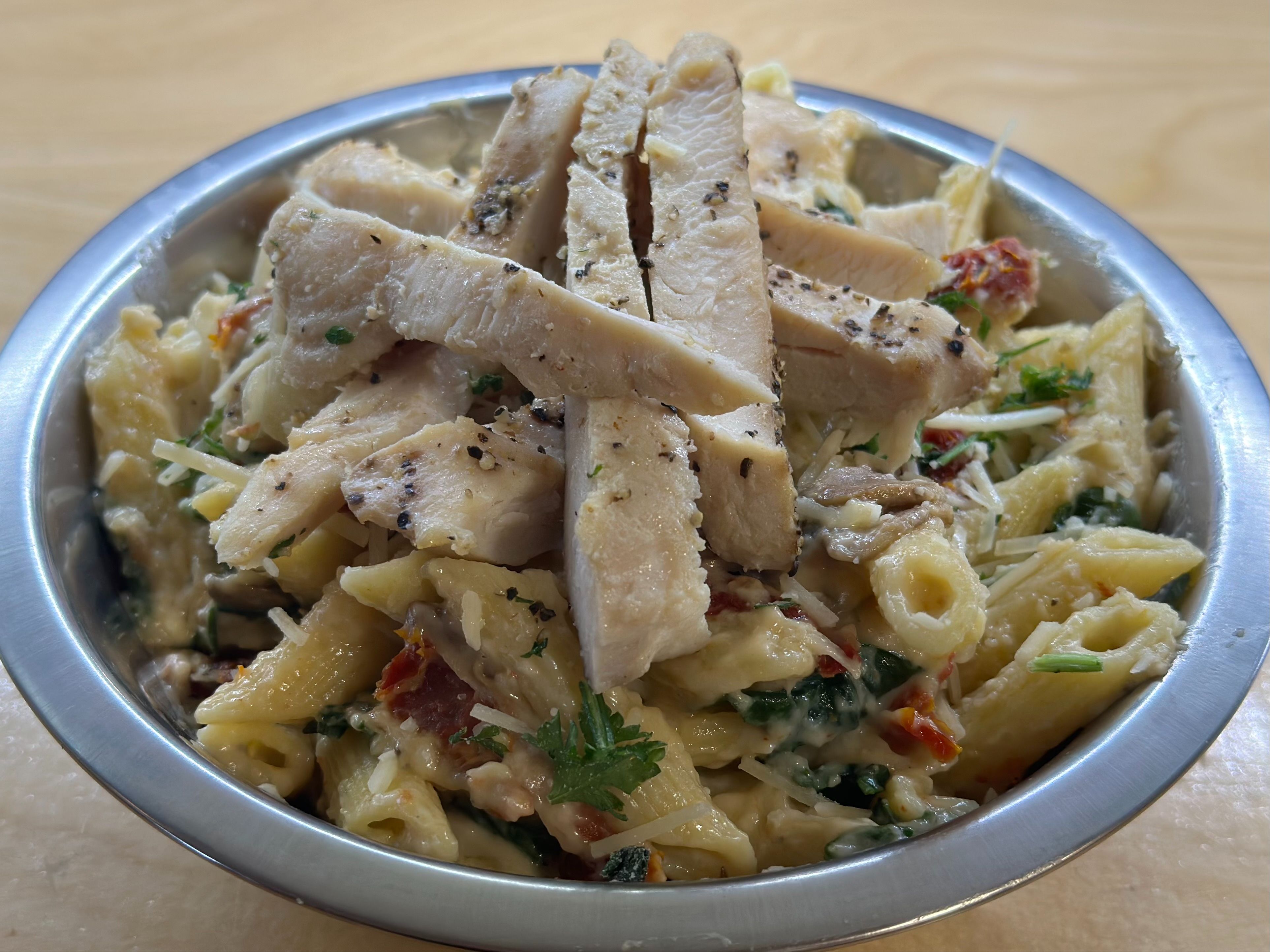 Penne Noodles Tossed In A Homemade Garlic Cream Sauce With Mushrooms, Sundried Tomatoes, Spinach & Onion Topped With Grilled Chicken