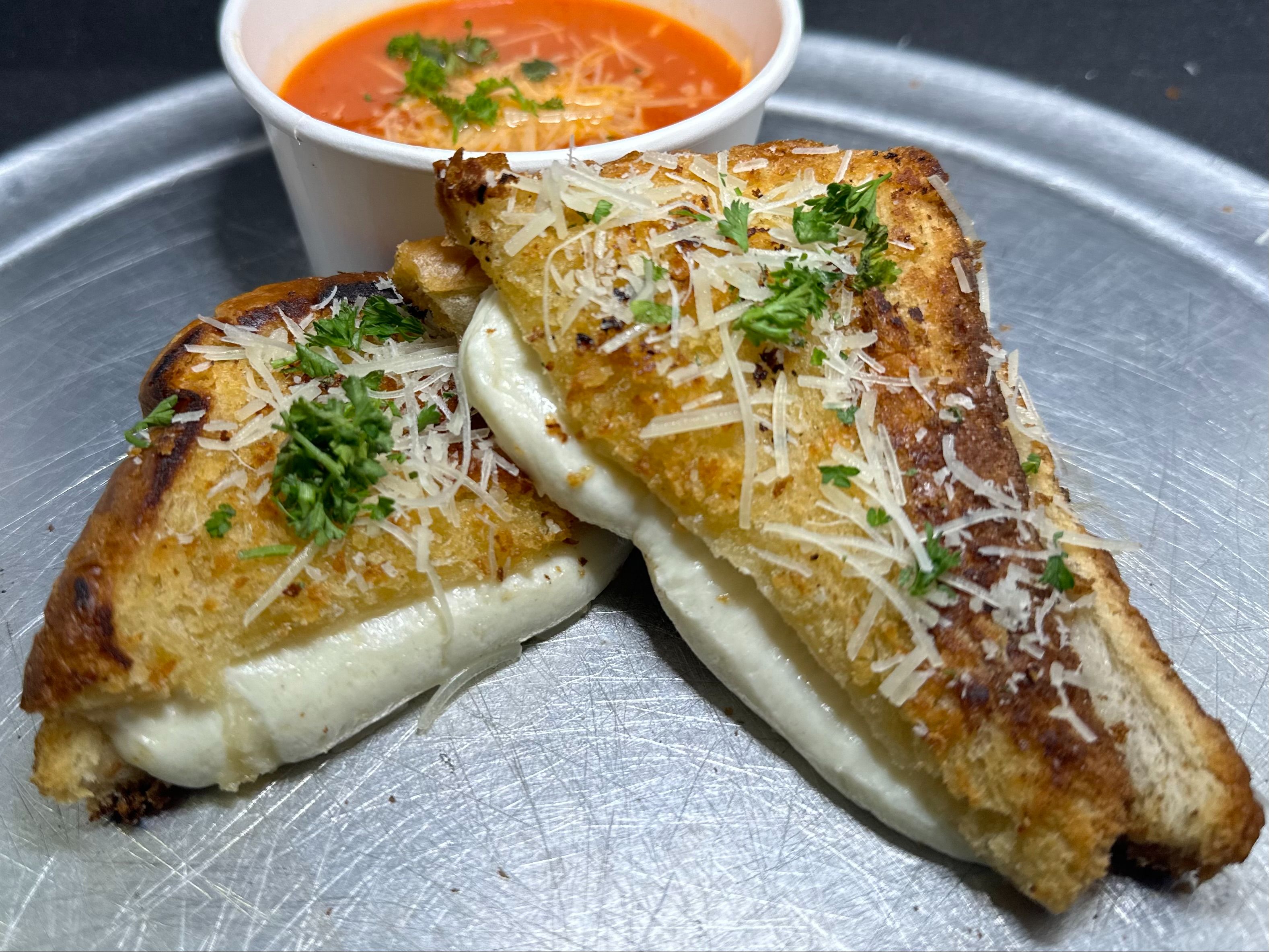 Two slices of bread lathered with an herby butter sauce with mozzarella cheese melted between them closed and covered in panko then pan fried and served with a side of marinara for dipping