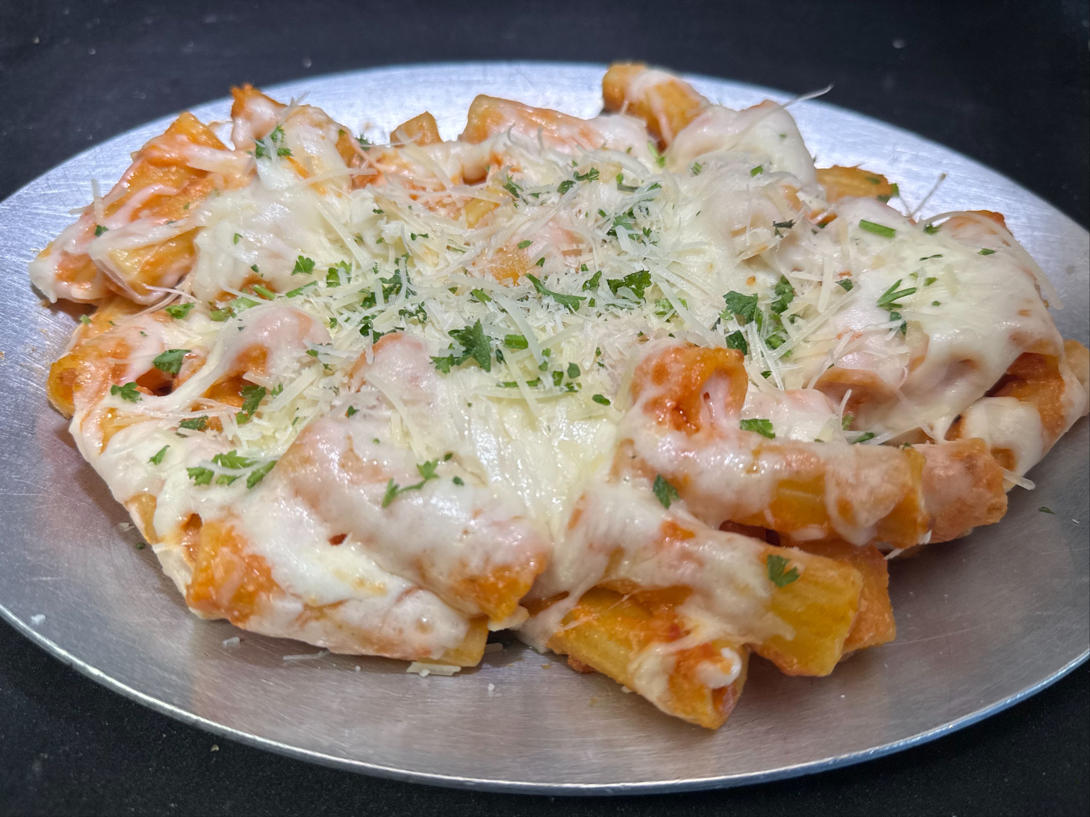 A blend of seasoned ricotta and marinara tossed in rigatoni noodles then baked with mozzarella on top