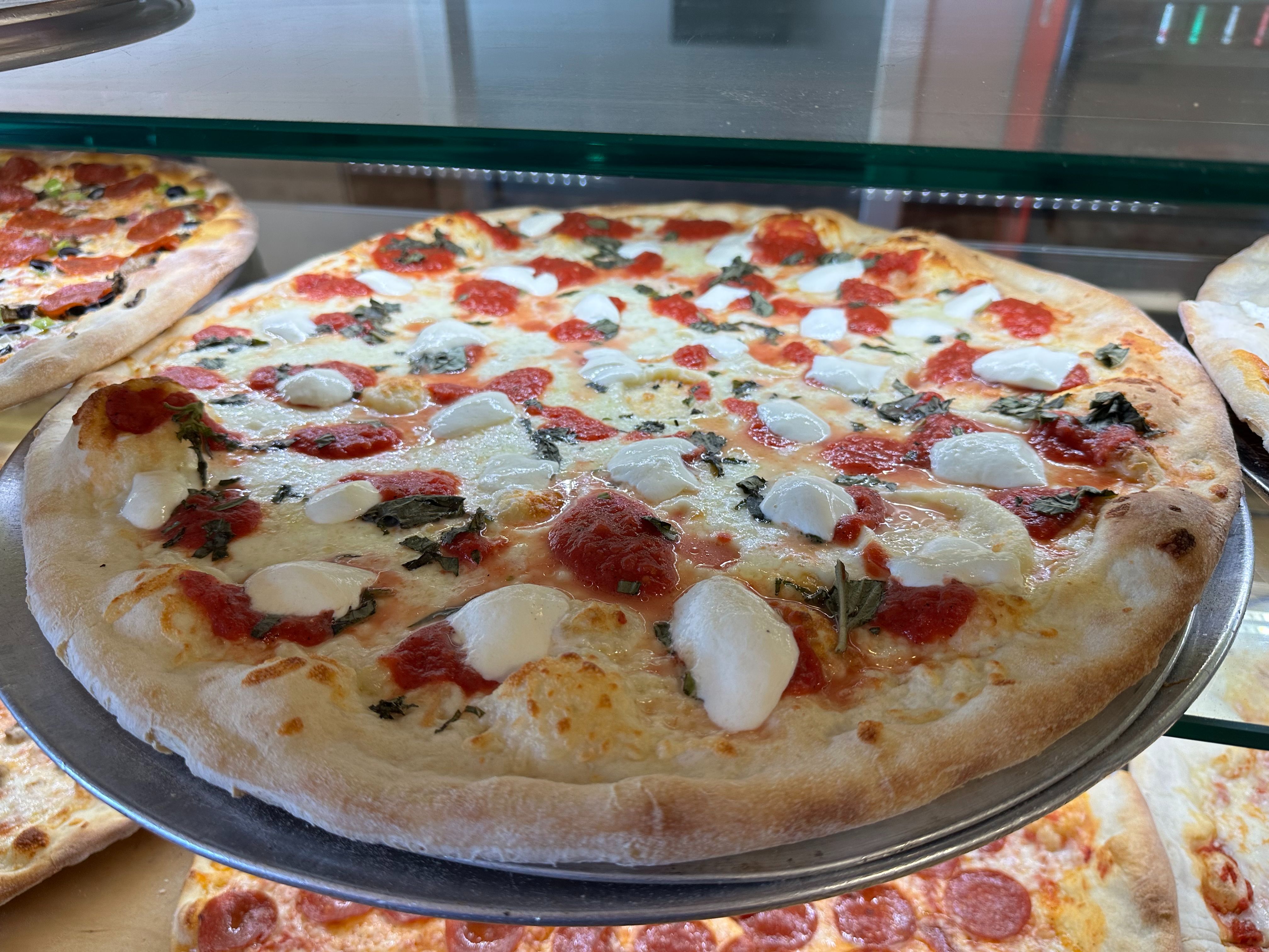 Square thin cut pizza with fresh garlic, basil, mozzarella & homemade tomato sauce