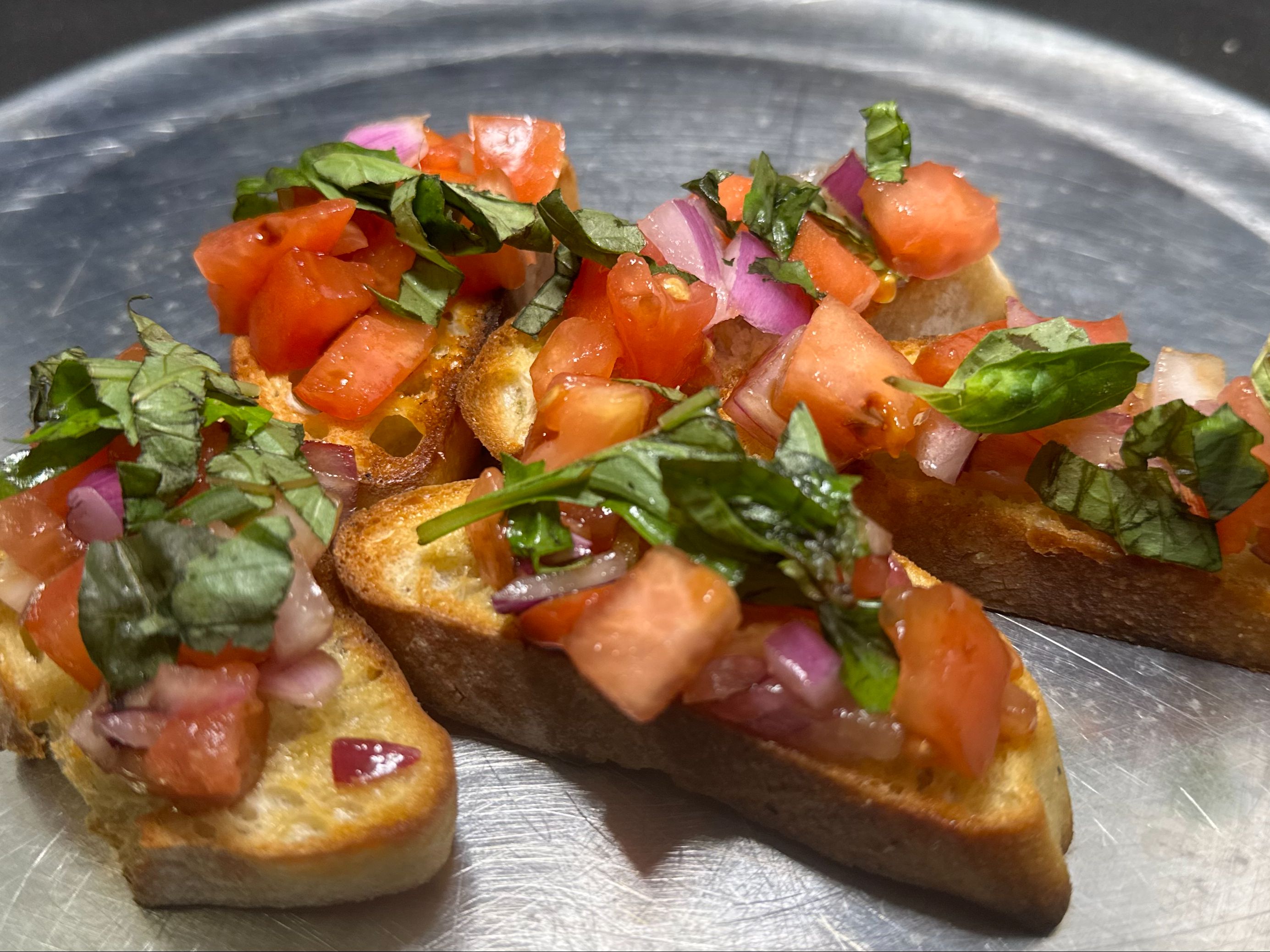 Slices of French Baguette toasted with olive oil then topped with tomato and red onion that have been tossed in a balsamic glaze then finished off with basil